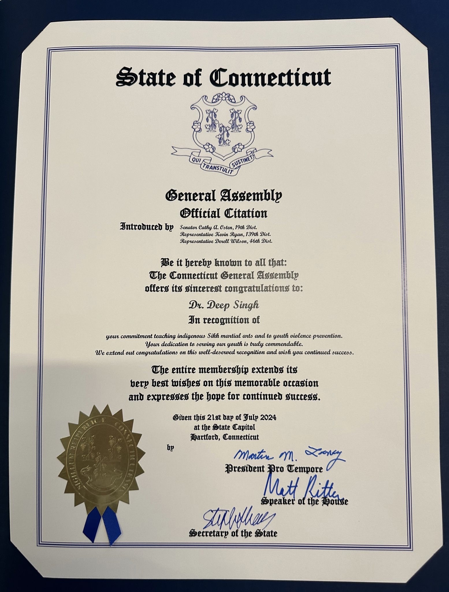 इस प्रशस्ति पत्र में मार्टिन लूनी, सदन के अध्यक्ष मैट रिटर और राज्य सचिव स्टेफनी थॉमस द्वारा भी हस्ताक्षर किया गया है। सिख आर्ट गैलरी, सीटी के निदेशक कुलजीत सिंह ने कहा, 'दीप सिंह की गटका टीम कनेक्टिकट में विभिन्न कार्यक्रमों में अपनी भागीदारी रखती है। यह निश्चित रूप से राज्य में अधिक सकारात्मकता ला रही है और राज्य को युवा हिंसा के मुद्दे से निपटने में मदद कर रही है।'