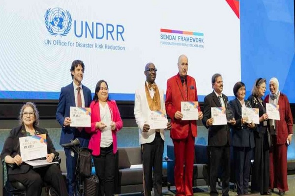 डॉ. मृत्युंजय महापात्रा (बाएं से छठे) संयुक्त राष्ट्र पुरस्कार के अन्य प्राप्तकर्ताओं के साथ। / UN Office for Disaster Risk Reduction
