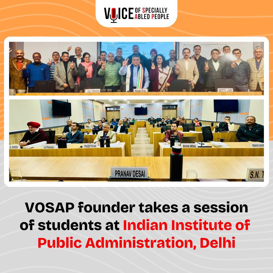 देसाई ने IAS, IRS, IPS और दूसरे बड़े अफसरों को ट्रेनिंग देने वाले IIPA में एक बहुत अच्छा सेशन लिया। 80 मिनट के इस सेशन में उन्होंने 'विजन 2047' के बारे में बताया। ये एक ऐसा प्लान है जिसमें भारत में दिव्यांग लोगों को ज्यादा ताकतवर बनाने की बात है। उन्होंने इन अफसरों को इस काम में अपना योगदान देने के लिए प्रेरित किया। इस सेशन में सेना के बड़े अफसर भी शामिल थे। उन्होंने VOSAP के काम को सपोर्ट किया और जमीनी स्तर पर मदद करने का वादा किया।