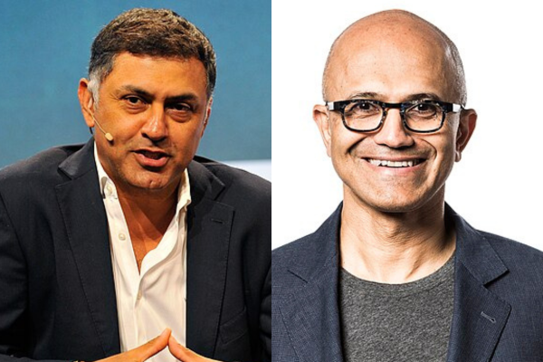 भारतीय मूल के दो सीईओ, निकेश अरोड़ा और सत्य नडेला। (बाएं से) / Wikipedia