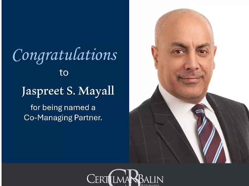 प्रसिद्ध लॉ फर्म Certilman Balin Adler & Hyman LLP ने घोषणा की है कि जसप्रीत एस. मायाल को 1 जनवरी 2026 से फर्म का को-मैनेजिंग पार्टनर नियुक्त किया गया है। वे ब्रेंडन जे. डे-रिगी के साथ मिलकर फर्म के संचालन, रणनीतिक फैसलों और दीर्घकालिक विकास का नेतृत्व करेंगे।