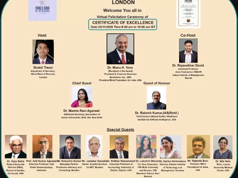 मनु वोरा ने वर्चुअली कार्यक्रम को अटेंड किया। / image providedइस कार्यक्रम में मुख्य अतिथि डॉ. ममता रानी अग्रवाल, अतिरिक्त सचिव, एसोसिएशन ऑफ इंडियन यूनिवर्सिटीज (शिक्षा मंत्रालय, भारत सरकार) थीं, जबकि डॉ. राकेश कुमार, IAS, चीफ एडवाइजर (ग्लोबल हेल्थ), वाधवानी इंस्टीट्यूट फॉर आर्टिफिशियल इंटेलिजेंस, USA, गेस्ट ऑफ ऑनर रहे। समारोह में नौ विशेष अतिथि ‘नव रत्न’ के रूप में शामिल हुए, डॉ. विजय बत्रा, प्रो. अनिल कुमार अग्रवाल, डॉ. सारिका श्रीवास्तव, जवाहर गोरडिया, राजेंदु बक्षी, डॉ. निला वोरा, देबाशीष सरकार, डॉ. लक्ष्मी मोहन और डॉ. श्रीधर रामामूर्ति। डॉ. मनु के. वोरा ने यह सम्मान अपने माता-पिता, केजी से पीजी तक के सभी शिक्षकों, भारत के 1.5 करोड़ नेत्रहीनों और पूरे देश के शिक्षकों को समर्पित किया।