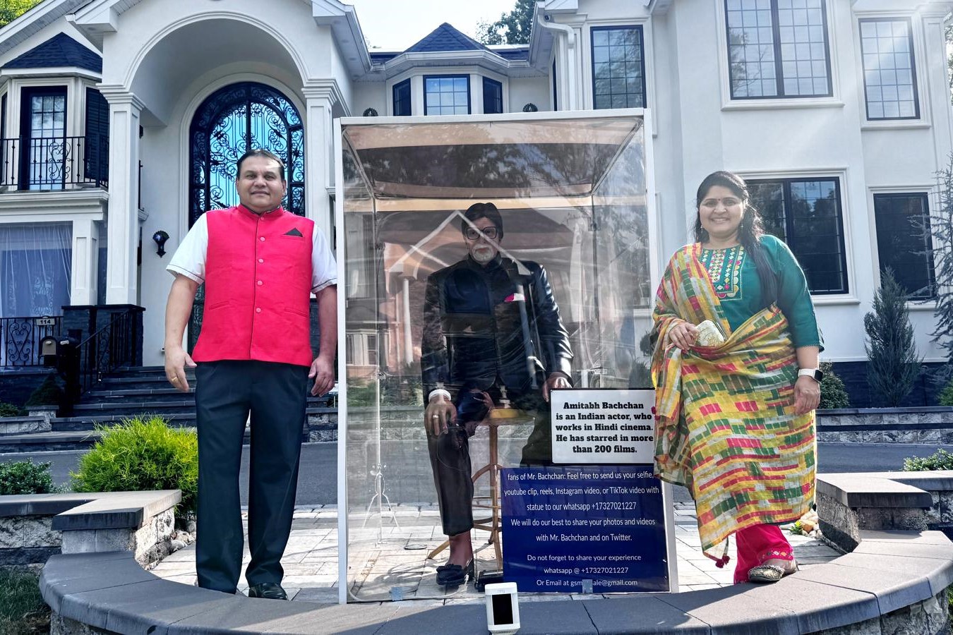 New Jersey-based Gopi Sheth and his wife pose with the Statue of the actor outside their home. / Courtesy/Gopi Sheth
