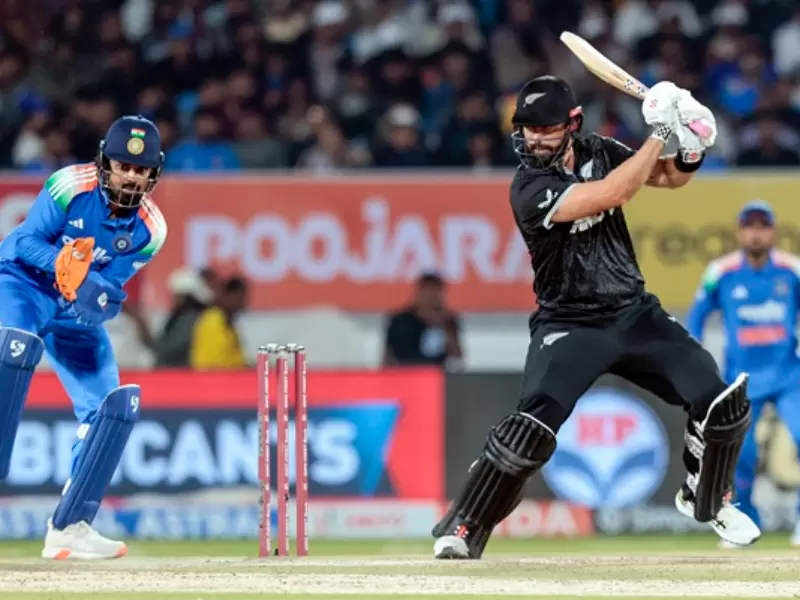 न्यूजीलैंड के डैरिल मिशेल ने बुधवार, 14 जनवरी, 2026 को राजकोट के निरंजन शाह स्टेडियम में भारत और न्यूजीलैंड के बीच खेले गए दूसरे वनडे क्रिकेट मैच के दौरान एक शानदार शॉट खेला। / IANS/Raj Kumar