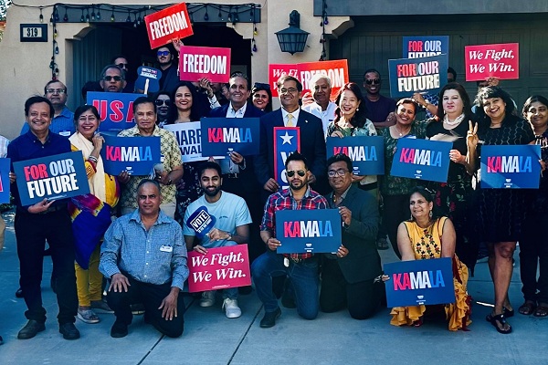भुटोरिया ने कमला हैरिस के दक्षिण एशियाई और एशियाई समर्थकों की बैठक बुलाई। चित्र में वे भी एक पोस्टर थामे खड़े हैं। / सौजन्य- अजय भुटोरिया