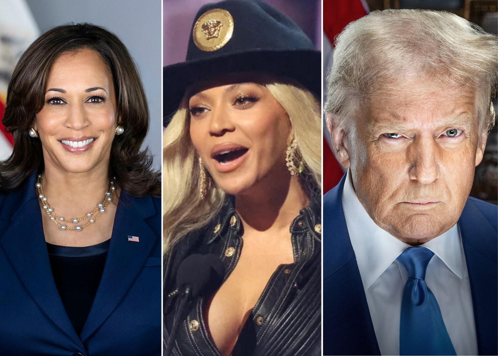 कमला हैरिस, पॉप सिंगर बियॉन्से और राष्ट्रपति डोनाल्ड ट्रम्प /