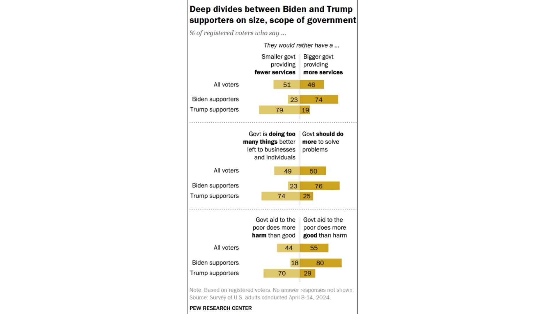 अमेरिकन्स व्यूज ऑफ गवर्नमेंट रोल : परसिस्टेंट डिवीजन्स एंड एरियाज ऑफ एग्रीमेंट शीर्षक वाली इस स्टडी के अनुसार, 74 प्रतिशत उत्तरदाता ज्यादा सेवाएं प्रदान करने वाली बड़ी सरकार को पसंद करते हैं। करीब 76 प्रतिशत का मानना है कि समस्याओं को हल करने के लिए सरकार को और अधिक काम करना चाहिए। 80 प्रतिशत सोचते हैं कि गरीबों को सरकारी सहायता से नुकसान से अधिक फायदा होता है। वहीं, इतनी ही संख्या में ट्रम्प समर्थक इन तीनों मुद्दों पर विपरीत विचार रखते हैं।