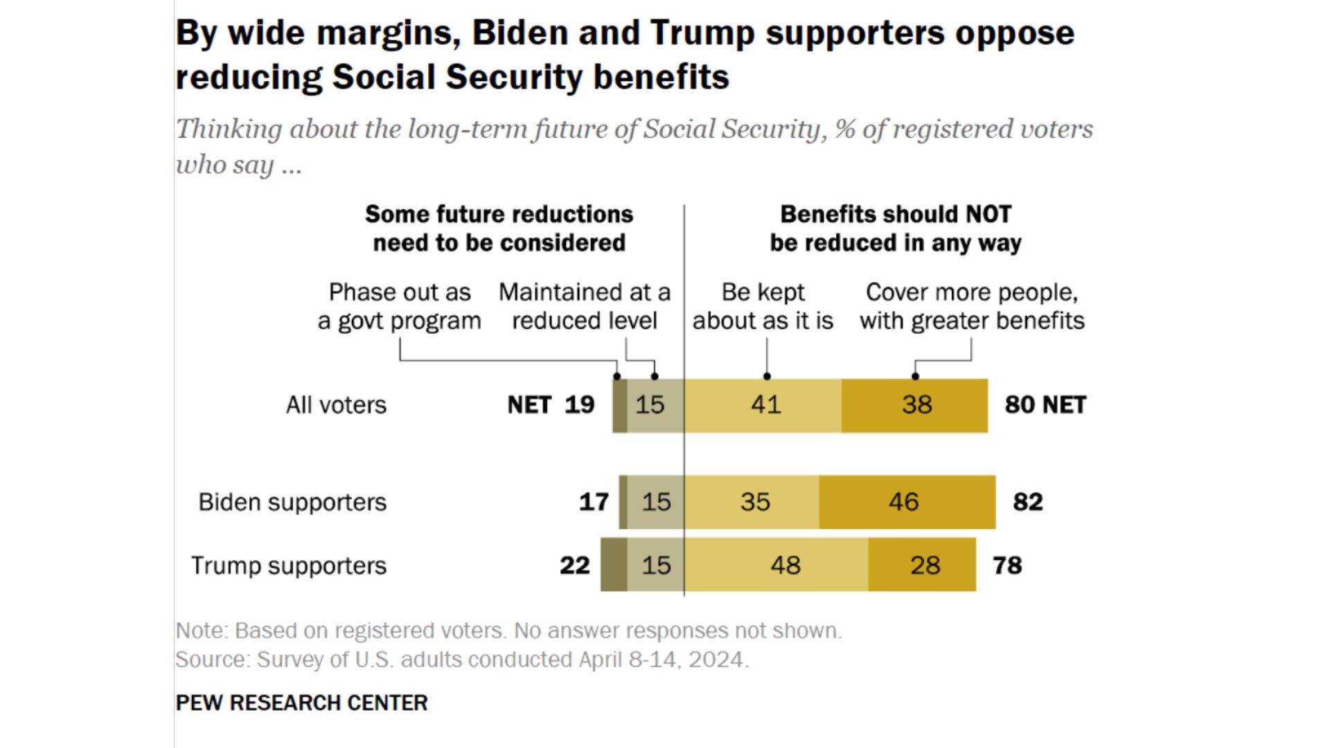 मतदाताओं में से लगभग 80 प्रतिशत इस बात पर सहमत हैं कि सामाजिक सुरक्षा लाभों को किसी तरह कम नहीं किया जाना चाहिए। ऐसा मानने वालों में 82 प्रतिशत बाइडेन समर्थक और 78 प्रतिशत ट्रम्प समर्थक हैं।