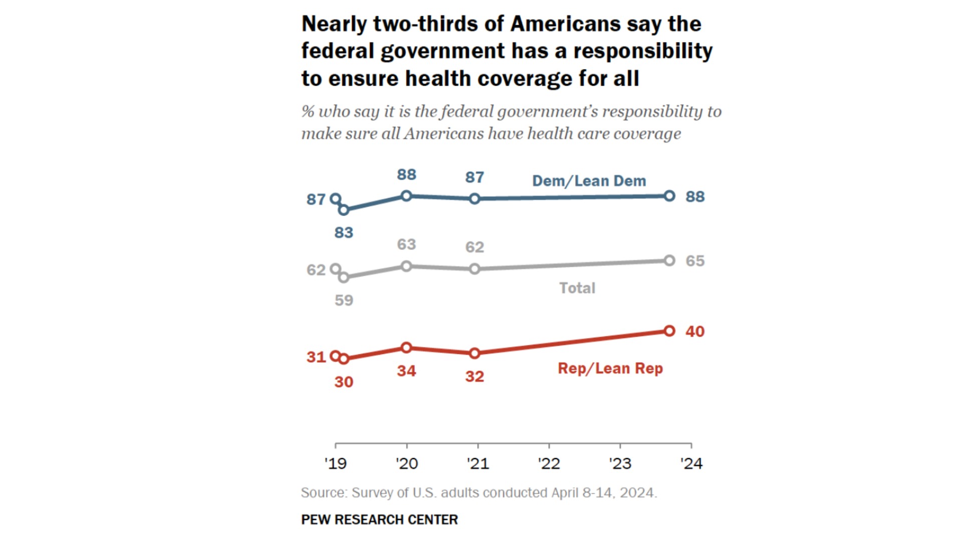 अधिकांश अमेरिकियों (करीब 65 प्रतिशत) का मानना है कि यह संघीय सरकार की जिम्मेदारी है कि वह सभी अमेरिकियों के पास स्वास्थ्य देखभाल कवरेज सुनिश्चित करे। करीब 88 प्रतिशत डेमोक्रेट कहते हैं कि ये संघीय सरकार की जिम्मेदारी है। वहीं 40 प्रतिशत रिपब्लिकन ऐसा विचार रखते हैं। 36 प्रतिशत अमेरिकी चाहते हैं कि स्वास्थ्य कवरेज का एकल राष्ट्रीय कार्यक्रम होना चाहिए जबकि 28 प्रतिशत सरकारी व निजी क्षेत्र को मिलाकर कवरेज की वकालत करते हैं।