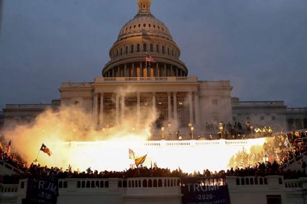 6 जनवरी, 2021 को वॉशिंगटन, अमेरिका में अमेरिकी कैपिटल बिल्डिंग के सामने अमेरिकी राष्ट्रपति डोनाल्ड ट्रम्प के समर्थकों के दंगे के दौरान पुलिस के गोला-बारूद के कारण हुआ विस्फोट देखा गया। / Reuters/Leah Millis