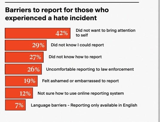 ਇਸ ਦੌਰਾਨ, ਜਿਨ੍ਹਾਂ ਲੋਕਾਂ ਨੇ ਅਜਿਹੀਆਂ ਘਟਨਾਵਾਂ ਦੀ ਰਿਪੋਰਟ ਨਹੀਂ ਕੀਤੀ, ਉਨ੍ਹਾਂ ਨੇ ਆਮ ਤੌਰ 'ਤੇ ਕਿਹਾ ਕਿ ਉਹ ਆਪਣੇ ਵੱਲ ਵਾਧੂ ਧਿਆਨ ਨਹੀਂ ਦੇਣਾ ਚਾਹੁੰਦੇ (42 ਪ੍ਰਤੀਸ਼ਤ)। ਹੋਰ ਕਾਰਨਾਂ ਵਿੱਚ ਇਹ ਨਾ ਜਾਣਨਾ ਸ਼ਾਮਲ ਹੈ ਕਿ ਇਹ ਉਹ ਚੀਜ਼ ਸੀ ਜੋ ਨਿਊਯਾਰਕ ਦੇ ਲੋਕ ਰਿਪੋਰਟ ਕਰ ਸਕਦੇ ਹਨ (29 ਪ੍ਰਤੀਸ਼ਤ), ਇਹ ਨਾ ਜਾਣਨਾ ਕਿ ਅਜਿਹੀਆਂ ਘਟਨਾਵਾਂ ਦੀ ਰਿਪੋਰਟ ਕਿਵੇਂ ਕਰਨੀ ਹੈ (27 ਪ੍ਰਤੀਸ਼ਤ), ਅਤੇ ਕਾਨੂੰਨ ਲਾਗੂ ਕਰਨ ਵਾਲੇ ਜਾਂ ਹੋਰ ਅਧਿਕਾਰੀਆਂ (26 ਪ੍ਰਤੀਸ਼ਤ) ਨੂੰ ਘਟਨਾ ਦੀ ਰਿਪੋਰਟ ਕਰਨ ਵਿੱਚ ਅਰਾਮ ਮਹਿਸੂਸ ਨਾ ਕਰਨਾ।