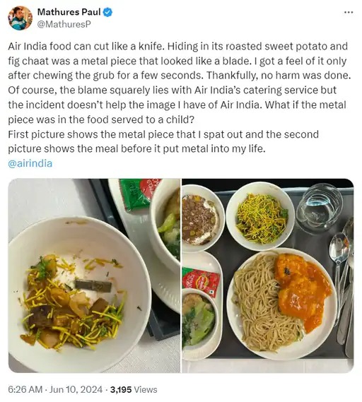 ਦਰਅਸਲ, ਮੈਥੁਰੇਸ ਪਾਲ ਨਾਂ ਦਾ ਯਾਤਰੀ ਏਅਰ ਇੰਡੀਆ ਦੀ ਫਲਾਈਟ ਰਾਹੀ ਬੈਂਗਲੁਰੂ ਤੋਂ ਸੈਨ ਫਰਾਂਸਿਸਕੋ ਜਾ ਰਿਹਾ ਸੀ। 10 ਜੂਨ ਨੂੰ, ਪੌਲ ਨੇ X 'ਤੇ ਏਅਰ ਇੰਡੀਆ ਦੀ ਫਲਾਈਟ ਵਿੱਚ ਖਾਣੇ ਵਿੱਚ ਮਿਲੇ ਬਲੇਡ ਦੀਆਂ ਦੋ ਫੋਟੋਆਂ ਸਾਂਝੀਆਂ ਕੀਤੀਆਂ।