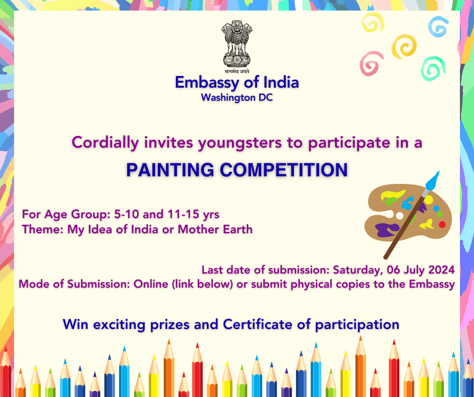 ਭਾਰਤੀ ਦੂਤਾਵਾਸ, ਵਾਸ਼ਿੰਗਟਨ ਡੀ.ਸੀ. ਨੇ ਪ੍ਰਵਾਸੀ ਭਾਰਤੀ ਬੱਚਿਆਂ ਨੂੰ ਪੇਂਟਿੰਗ ਮੁਕਾਬਲੇ ਵਿੱਚ ਹਿੱਸਾ ਲੈਣ ਲਈ ਸੱਦਾ ਦਿੱਤਾ ਹੈ। ਦੂਤਾਵਾਸ ਵੱਲੋਂ ਦੱਸਿਆ ਗਿਆ ਹੈ ਕਿ ਭਾਰਤੀ ਪ੍ਰਵਾਸੀ ਭਾਈਚਾਰੇ ਦੇ ਬੱਚਿਆਂ ਨੂੰ 'ਮੇਰਾ ਭਾਰਤ' ਜਾਂ 'ਮਾ ਪ੍ਰਿਥਵੀ' ਥੀਮ 'ਤੇ ਆਪਣੀ ਕਲਾ ਦਾ ਪ੍ਰਦਰਸ਼ਨ ਕਰਨ ਦਾ ਮੌਕਾ ਮਿਲੇਗਾ। ਇਸ ਮੁਕਾਬਲੇ ਵਿੱਚ ਭਾਗ ਲੈਣ ਵਾਲਿਆਂ ਨੂੰ ਦਿਲਚਸਪ ਇਨਾਮ ਅਤੇ ਭਾਗੀਦਾਰੀ ਦਾ ਸਰਟੀਫਿਕੇਟ ਮਿਲੇਗਾ।