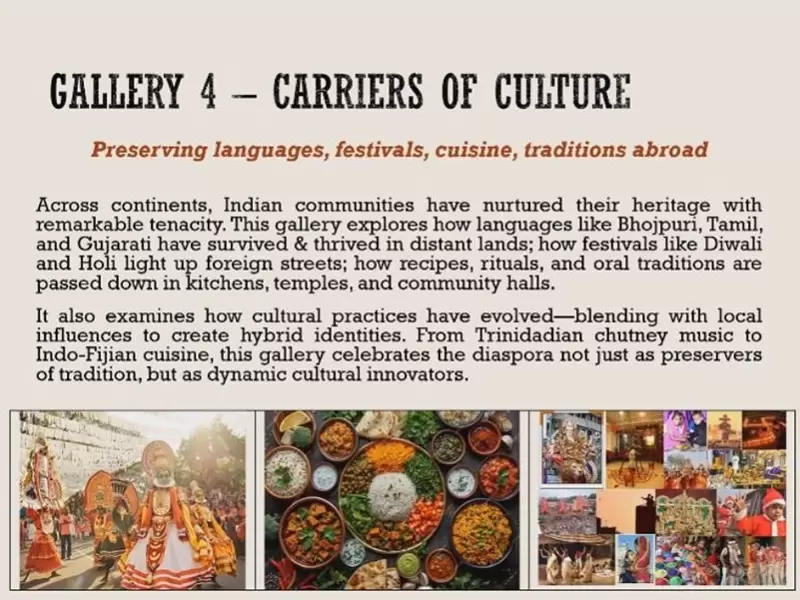 ਤੀਜੀ 'ਗਲੋਬਲ ਇੰਡੀਅਨ ਫੁੱਟਪ੍ਰਿੰਟ' ਗੈਲਰੀ ਰਾਜਨੀਤੀ, ਵਿਗਿਆਨ, ਕਾਰੋਬਾਰ, ਸਿਨੇਮਾ ਅਤੇ ਦਵਾਈ ਵਰਗੇ ਖੇਤਰਾਂ ਵਿੱਚ ਭਾਰਤੀਆਂ ਦੀਆਂ ਵਿਸ਼ਵਵਿਆਪੀ ਪ੍ਰਾਪਤੀਆਂ ਨੂੰ ਪ੍ਰਦਰਸ਼ਿਤ ਕਰੇਗੀ। ਚੌਥੀ 'ਕੈਰੀਅਰਜ਼ ਆਫ਼ ਕਲਚਰ' ਗੈਲਰੀ ਇਹ ਦਰਸਾਏਗੀ ਕਿ ਕਿਵੇਂ ਭਾਰਤੀ ਪ੍ਰਵਾਸੀਆਂ ਨੇ ਵਿਦੇਸ਼ਾਂ ਵਿੱਚ ਆਪਣੀ ਭਾਸ਼ਾ, ਤਿਉਹਾਰਾਂ, ਭੋਜਨ ਅਤੇ ਪਰੰਪਰਾਵਾਂ ਨੂੰ ਜ਼ਿੰਦਾ ਰੱਖਿਆ।