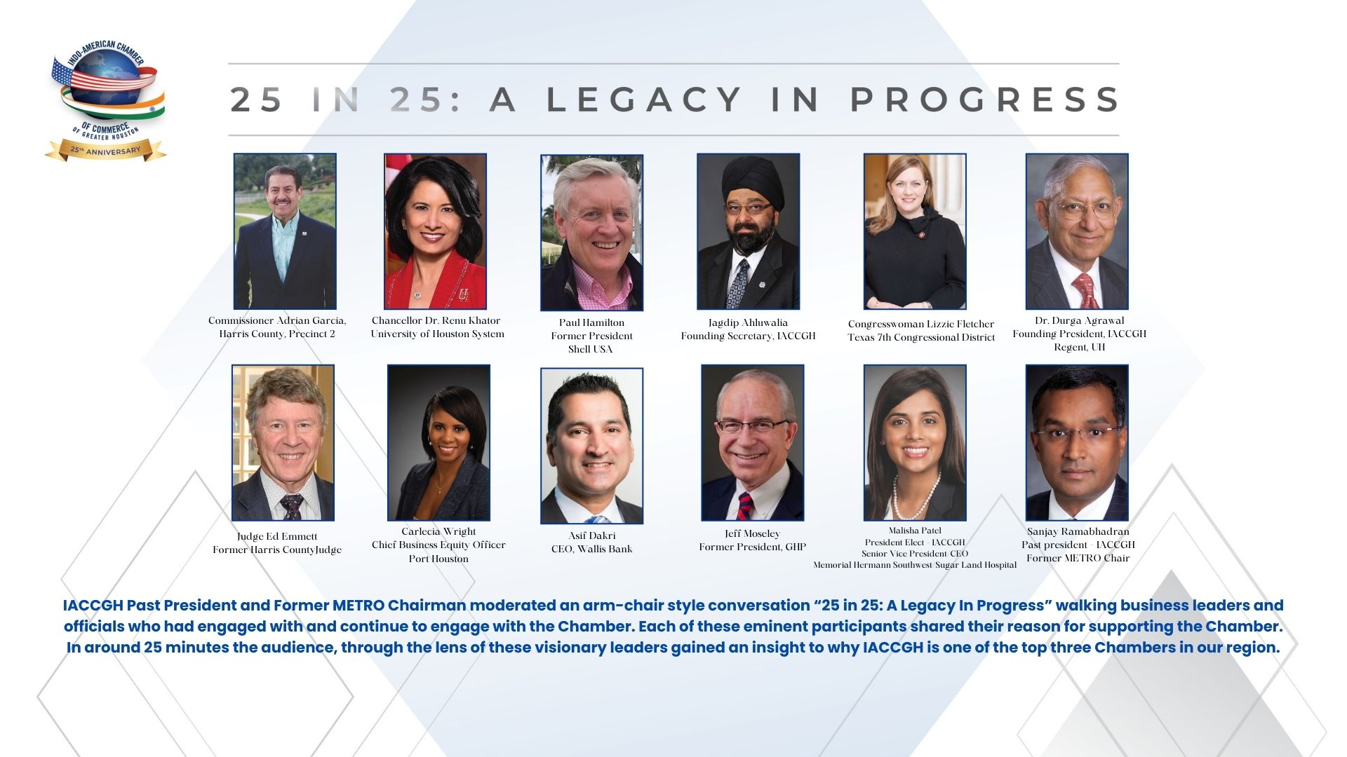 ਜਗਦੀਪ ਆਹਲੂਵਾਲੀਆ, ਕਾਰਜਕਾਰੀ ਨਿਰਦੇਸ਼ਕ, IACCGH ਨੇ ਉਦਘਾਟਨੀ ਭਾਸ਼ਣ ਦਿੱਤਾ, ਜਿਸ ਤੋਂ ਬਾਅਦ ਰਾਜੀਵ ਭਾਵਸਰ, ਪ੍ਰਧਾਨ, IACCGH ਨੇ ਸਵਾਗਤੀ ਭਾਸ਼ਣ ਦਿੱਤਾ। ਸੰਜੇ ਰਾਮਭਦਰਨ ਦੀ ਪ੍ਰਧਾਨਗੀ ਹੇਠ ਇੱਕ ਪੈਨਲ ਚਰਚਾ ਹੋਈ। ਉਸਨੇ ਪਿਛਲੇ 25 ਸਾਲਾਂ ਵਿੱਚ ਚੈਂਬਰ ਦੇ ਪ੍ਰਮੁੱਖ ਮੀਲ ਪੱਥਰਾਂ ਨੂੰ ਪ੍ਰਦਰਸ਼ਿਤ ਕੀਤਾ। ਪੈਨਲ ਵਿੱਚ ਪ੍ਰਸਿੱਧ ਵਿਅਕਤੀ ਸ਼ਾਮਲ ਸਨ ਜਿਵੇਂ ਕਿ ਡਾ. ਦੁਰਗਾ ਅਗਰਵਾਲ, IACCGH ਦੇ ਸੰਸਥਾਪਕ ਪ੍ਰਧਾਨ, ਪਾਲ ਹੈਮਿਲਟਨ, ਅਤੇ ਡਾ. ਰੇਣੂ ਖੱਟਰ, ਯੂਨੀਵਰਸਿਟੀ ਆਫ਼ ਹਿਊਸਟਨ ਸਿਸਟਮ ਦੀ ਚਾਂਸਲਰ।