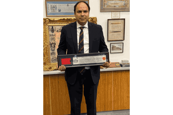 ਅਜੀਤ ਮਿਸ਼ਰਾ ਆਪਣਾ ਫ੍ਰੀਡਮ ਆਫ਼ ਦ ਸਿਟੀ ਆਫ਼ ਲੰਡਨ ਅਵਾਰਡ ਦਿਖਾਉਂਦੇ ਹੋਏ / ਲਿੰਕਡਇਨ
