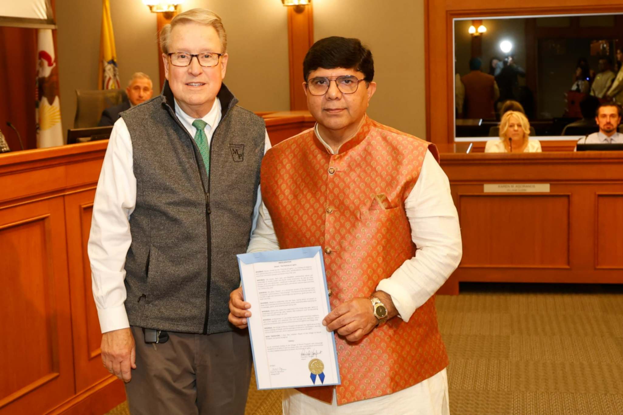 ਮਾਊਂਟ ਪ੍ਰਾਸਪੈਕਟ ਦੇ ਮੇਅਰ ਪਾਲ ਡਬਲਯੂਐਮ ਹੋਫਰਟ, ਗਲੋਬਲ ਇੰਡੀਅਨ ਡਾਇਸਪੋਰਾ ਫਾਊਂਡੇਸ਼ਨ ਦੇ ਪ੍ਰਧਾਨ ਰਾਕੇਸ਼ ਮਲਹੋਤਰਾ / J. K Trivedi