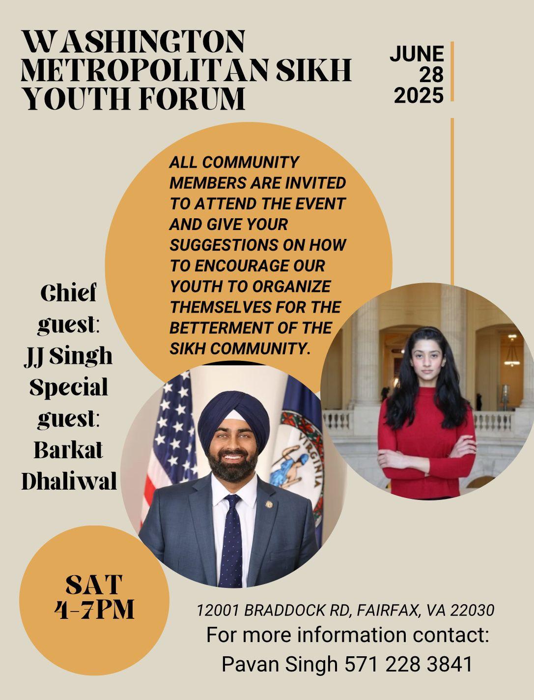 ਵਾਸ਼ਿੰਗਟਨ ਮੈਟਰੋਪੋਲੀਟਨ ਏਰੀਆ ਦਾ ਸਿੱਖ ਭਾਈਚਾਰਾ ਇੱਕ ਪ੍ਰੇਰਨਾਦਾਇਕ ਸਮਾਗਮ, "ਵਾਸ਼ਿੰਗਟਨ ਮੈਟਰੋਪੋਲੀਟਨ ਸਿੱਖ ਯੂਥ ਫੋਰਮ" ਲਈ ਇਕੱਠਾ ਹੋ ਰਿਹਾ ਹੈ, ਜੋ ਕਿ ਸ਼ਨੀਵਾਰ, 28 ਜੂਨ, 2025 ਨੂੰ ਸ਼ਾਮ 4:00 ਵਜੇ ਤੋਂ 7:00 ਵਜੇ ਤੱਕ 12001 ਬ੍ਰੈਡੌਕ ਰੋਡ, ਫੇਅਰਫੈਕਸ, ਵਰਜੀਨੀਆ ਵਿਖੇ ਆਯੋਜਿਤ ਕੀਤਾ ਜਾ ਰਿਹਾ ਹੈ।