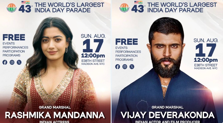 ਫੈਡਰੇਸ਼ਨ ਆਫ਼ ਇੰਡੀਆਨ ਅਸੋਸੀਏਸ਼ਨ (FIA) ਨੇ ਐਲਾਨ ਕੀਤਾ ਹੈ ਕਿ ਭਾਰਤੀ ਅਭਿਨੇਤਰੀ ਰਸ਼ਮਿਕਾ ਮੰਦਾਨਾ ਅਤੇ ਅਭਿਨੇਤਾ ਵਿਜੇ ਦੇਵਰਕੋਂਡਾ ਨਿਊਯਾਰਕ ਸਿਟੀ ਵਿੱਚ ਹੋਣ ਵਾਲੀ 43ਵੀਂ ਸਾਲਾਨਾ ਭਾਰਤ ਦਿਵਸ ਪਰੇਡ ਵਿੱਚ ਗ੍ਰੈਂਡ ਮਾਰਸ਼ਲ ਦੇ ਤੌਰ 'ਤੇ ਭਾਗ ਲੈਣਗੇ, ਯਾਨੀ ਕਿ ਪਰੇਡ ਦੀ ਅਗਵਾਈ ਕਰਨਗੇ। ਇਹ ਐਲਾਨ 27 ਜੂਨ ਨੂੰ ਨਿਊਯਾਰਕ ਸਥਿਤ ਭਾਰਤ ਦੇ ਦੂਤਾਵਾਸ ਵਿੱਚ ਆਯੋਜਿਤ ਇੱਕ ਸਮਾਰੋਹ ਦੌਰਾਨ ਕੀਤਾ ਗਿਆ।