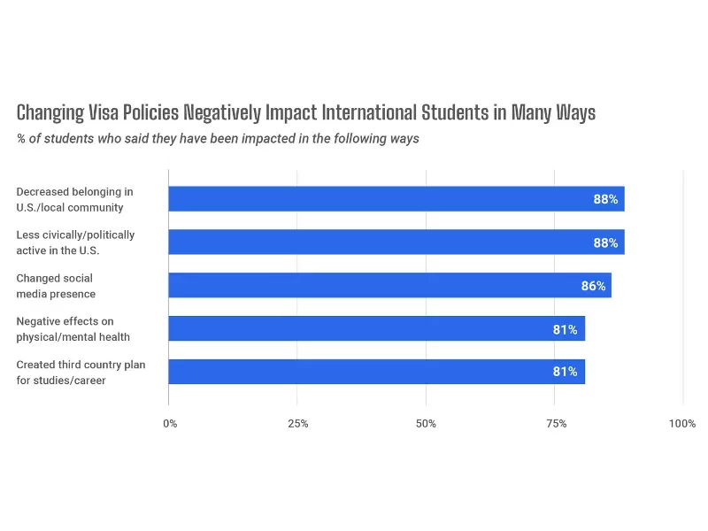 ਰਿਪੋਰਟ ਦੇ ਅਨੁਸਾਰ, ਅਮਰੀਕਾ ਵਿੱਚ 72 ਫ਼ੀਸਦੀ ਅੰਤਰਰਾਸ਼ਟਰੀ ਵਿਦਿਆਰਥੀ ਏਸ਼ੀਆ ਤੋਂ ਹਨ, ਜਿਨ੍ਹਾਂ ਵਿੱਚ ਸਭ ਤੋਂ ਵੱਡੀ ਗਿਣਤੀ ਭਾਰਤ ਅਤੇ ਚੀਨ ਤੋਂ ਆਏ ਵਿਦਿਆਰਥੀਆਂ ਦੀ ਹੈ। 36 ਯੂਨੀਵਰਸਿਟੀਆਂ ਤੋਂ ਇਕੱਠੇ ਕੀਤੇ ਗਏ ਸਰਵੇਖਣ ਜਵਾਬਾਂ ਤੋਂ ਪਤਾ ਲੱਗਦਾ ਹੈ ਕਿ ਵਿਦਿਆਰਥੀਆਂ ਵਿੱਚ ਡਰ ਦਾ ਮਾਹੌਲ, ਅਪਣਾਪਨ ਘਟਣ ਦੀ ਭਾਵਨਾ ਅਤੇ ਨਿਗਰਾਨੀ ਸੰਬੰਧੀ ਚਿੰਤਾਵਾਂ ਜ਼ਿਆਦਾ ਹਨ, ਜੋ ਦੇਸ਼ ਭਰ ਵਿੱਚ ਵਿਦਿਆਰਥੀਆਂ ਉੱਤੇ ਪੈਂਦੇ ਭਾਵਨਾਤਮਕ ਅਤੇ ਅਕਾਦਮਿਕ ਦਬਾਅ ਨੂੰ ਦਰਸਾਉਂਦੀਆਂ ਹਨ। ਸਿਰਫ਼ 4 ਫ਼ੀਸਦੀ ਵਿਦਿਆਰਥੀਆਂ ਨੇ ਕਿਹਾ ਕਿ ਉਹ ਆਪਣੇ ਆਪ ਨੂੰ ਸੁਰੱਖਿਅਤ ਮਹਿਸੂਸ ਕਰਦੇ ਹਨ।