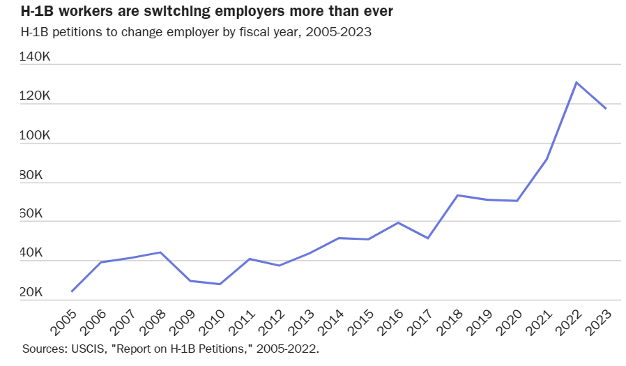 H-1B ਵੀਜ਼ਾ ਧਾਰਕਾਂ ਵਿੱਚ ਨੌਕਰੀਆਂ ਵਿੱਚ ਤਬਦੀਲੀਆਂ ਵੱਧ ਰਹੀਆਂ ਹਨ, 2005 ਵਿੱਚ ਲਗਭਗ 24,000 ਤੋਂ ਵਧ ਕੇ 2022 ਵਿੱਚ ਰਿਕਾਰਡ 130,576 ਹੋ ਗਈਆਂ, ਜੋ ਪੰਜ ਗੁਣਾ ਵੱਧ ਹੈ।