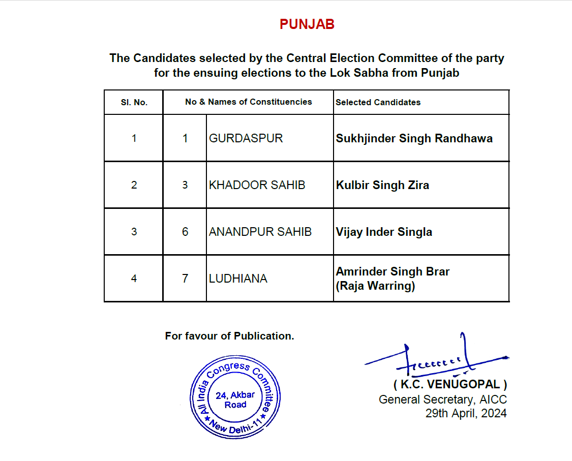 ਲੋਕ ਸਭਾ ਦੀਆਂ ਚਾਰ ਸੀਟਾਂ ਲਈ ਉਮੀਦਵਾਰਾਂ ਦਾ ਐਲਾਨ ਕਰ ਦਿੱਤਾ ਗਿਆ ਹੈ / fb @ Indian National Congress
