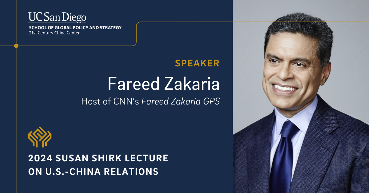 ਭਾਰਤੀ-ਅਮਰੀਕੀ ਪੱਤਰਕਾਰ, ਅਤੇ CNN ਦੇ "ਫਰੀਦ ਜ਼ਕਾਰੀਆ GPS" ਦੇ ਹੋਸਟ, ਫਰੀਦ ਜ਼ਕਾਰੀਆ, UC ਸੈਨ ਡਿਏਗੋ ਵਿਖੇ, 7 ਅਗਸਤ ਨੂੰ ਯੂ.ਐੱਸ.-ਚੀਨ ਸਬੰਧਾਂ 'ਤੇ 2024 ਲੈਕਚਰ ਦੇਣਗੇ। ਇਹ ਇਵੈਂਟ UC ਸੈਨ ਡਿਏਗੋ ਚਾਈਨਾ ਫੋਰਮ ਦਾ ਹਿੱਸਾ ਹੈ, ਜਿਸ ਦਾ ਆਯੋਜਨ UC ਸੈਨ ਡਿਏਗੋ ਸਕੂਲ ਆਫ ਗਲੋਬਲ ਪਾਲਿਸੀ ਐਂਡ ਸਟ੍ਰੈਟਜੀ ਦੇ 21ਵੀਂ ਸਦੀ ਚਾਈਨਾ ਸੈਂਟਰ ਦੁਆਰਾ ਕੀਤਾ ਗਿਆ ਹੈ।