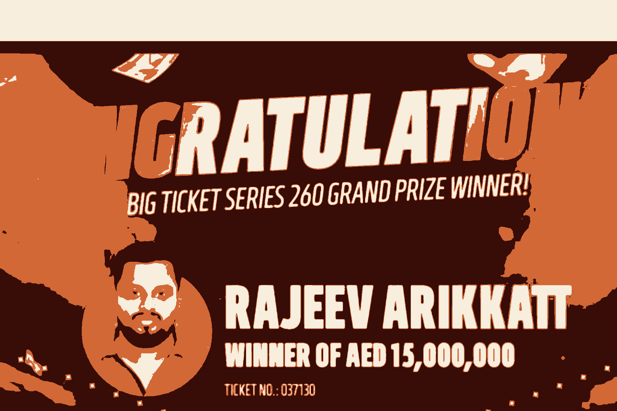 ਰਾਜੀਵ ਦੇ ਅਬੂ ਧਾਬੀ ਵੀਕਲੀ ਡਰਾਅ 'ਚ 15 ਮਿਲੀਅਨ ਦਿਰਹਮ (ਕਰੀਬ 33 ਕਰੋੜ ਰੁਪਏ) ਦੀ ਲਾਟਰੀ ਲੱਗੀ ਹੈ। / bigticket.ae