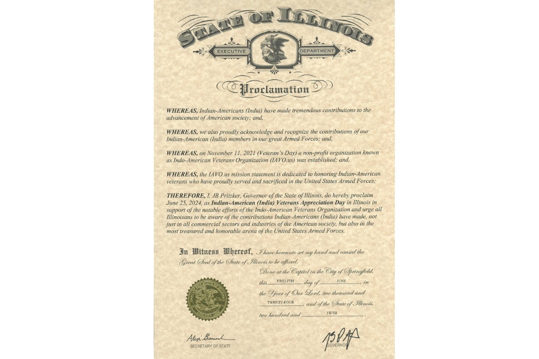 ਇਲੀਨੋਇਸ ਦੇ ਗਵਰਨਰ ਜੇਬੀ ਪ੍ਰਿਟਜ਼ਕਰ ਨੇ 12 ਜੂਨ ਨੂੰ ਇੱਕ ਘੋਸ਼ਣਾ ਪੱਤਰ 'ਤੇ ਹਸਤਾਖਰ ਕੀਤੇ। ਇਸ ਵਿੱਚ 25 ਜੂਨ ਨੂੰ ਭਾਰਤੀ-ਅਮਰੀਕੀ (ਭਾਰਤ) ਵੈਟਰਨਜ਼ ਪ੍ਰਸ਼ੰਸਾ ਦਿਵਸ ਐਲਾਨਿਆ ਗਿਆ। ਇਹ ਐਲਾਨ ਭਾਰਤੀ-ਅਮਰੀਕੀ ਭਾਈਚਾਰੇ ਨਾਲ ਸਬੰਧਤ ਸਾਬਕਾ ਸੈਨਿਕਾਂ ਨੂੰ ਦੇਸ਼ ਦੇ ਵੱਖ-ਵੱਖ ਖੇਤਰਾਂ ਵਿੱਚ ਪਾਏ ਯੋਗਦਾਨ ਨੂੰ ਮਾਨਤਾ ਦੇ ਕੇ ਸਨਮਾਨਿਤ ਕਰਨ ਦੇ ਉਦੇਸ਼ ਨਾਲ ਕੀਤਾ ਗਿਆ ਹੈ।