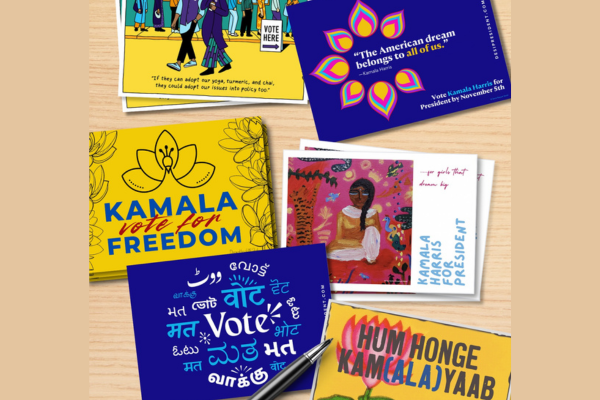 ਇਹ ਪੋਸਟਕਾਰਡ ਦੱਖਣੀ ਏਸ਼ੀਆਈ ਕਲਾਕਾਰਾਂ ਦੁਆਰਾ ਕਲਾਕਾਰੀ ਨਾਲ ਤਿਆਰ ਕੀਤੇ ਗਏ ਹਨ , ਜਿੰਨ੍ਹਾਂ ਵਿੱਚ "ਹਮ ਹੋਂਗੇ ਕਮਲਯਾਬ" ਵਰਗੇ ਸੰਦੇਸ਼ ਹਨ। ਇਹਨਾਂ ਦਾ ਟੀਚਾ ਦੱਖਣੀ ਏਸ਼ੀਆਈ ਵੋਟਰਾਂ ਨਾਲ ਨਿੱਜੀ ਤਰੀਕੇ ਨਾਲ ਜੁੜਨਾ ਹੈ।