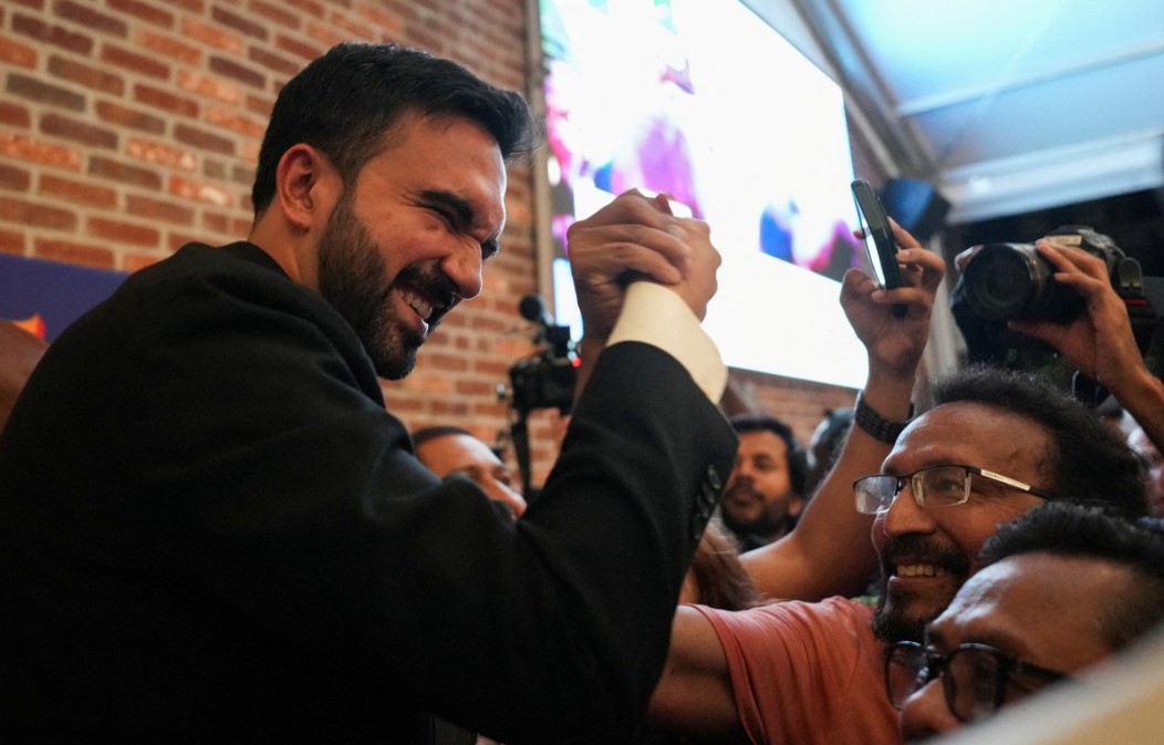 ਜ਼ੋਹਰਾਨ ਮਮਦਾਨੀ 25 ਜੂਨ, 2025 ਨੂੰ ਨਿਊਯਾਰਕ ਸਿਟੀ ਵਿੱਚ ਆਪਣੀ ਪ੍ਰਾਇਮਰੀ ਚੋਣ ਲਈ ਰੱਖੀ ਗਈ ਵਾਚ ਪਾਰਟੀ ਦੌਰਾਨ ਇੱਕ ਸਮਰਥਕ ਨੂੰ ਮਿਲਦੇ ਹੋਏ। ਇਹ ਚੋਣ ਉਨ੍ਹਾਂ ਦੀ ਨਵੰਬਰ 2025 ਵਿੱਚ ਹੋਣ ਵਾਲੀ ਨਿਊਯਾਰਕ ਸਿਟੀ ਦੇ ਮੇਅਰ ਲਈ ਡੈਮੋਕਰੇਟਿਕ ਉਮੀਦਵਾਰ ਬਣਨ ਦੀ ਕੋਸ਼ਿਸ਼ ਦਾ ਹਿੱਸਾ ਸੀ। / courtesy photo