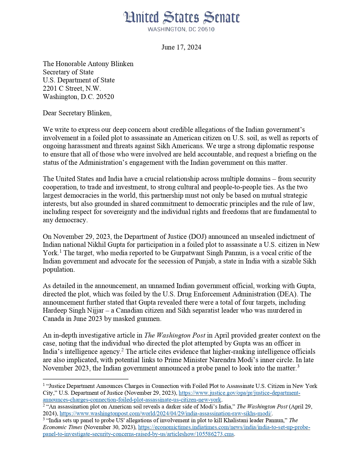 ਯੂਐਸ ਵਿੱਚ ਡੈਮੋਕਰੇਟਿਕ ਸੈਨੇਟਰਾਂ ਨੇ ਜੂਨ.17 ਨੂੰ ਅਮਰੀਕੀ ਵਿਦੇਸ਼ ਮੰਤਰੀ ਐਂਥਨੀ ਬਲਿੰਕਨ ਨੂੰ ਇੱਕ ਪੱਤਰ ਲਿਖ ਕੇ, ਅਮਰੀਕਾ ਦੀ ਧਰਤੀ ਉੱਤੇ ਇੱਕ ਸਿੱਖ ਵੱਖਵਾਦੀ ਦੀ ਹੱਤਿਆ ਦੀ ਇੱਕ ਅਸਫਲ ਸਾਜ਼ਿਸ਼ ਵਿੱਚ ਭਾਰਤ ਸਰਕਾਰ ਦੀ ਸ਼ਮੂਲੀਅਤ ਦੇ ਦੋਸ਼ਾਂ ਬਾਰੇ ਆਪਣੀਆਂ ਚਿੰਤਾਵਾਂ ਜ਼ਾਹਰ ਕੀਤੀਆਂ। ਇਸ ਪੱਤਰ 'ਤੇ ਸੈਨੇਟਰ ਜੈਫ ਮਰਕਲੇ, ਰੌਨ ਵਾਈਡਨ, ਟਿਮ ਕੇਨ, ਬਰਨੀ ਸੈਂਡਰਸ ਅਤੇ ਕ੍ਰਿਸ ਵੈਨ ਹੋਲੇਨ ਨੇ ਦਸਤਖਤ ਕੀਤੇ।