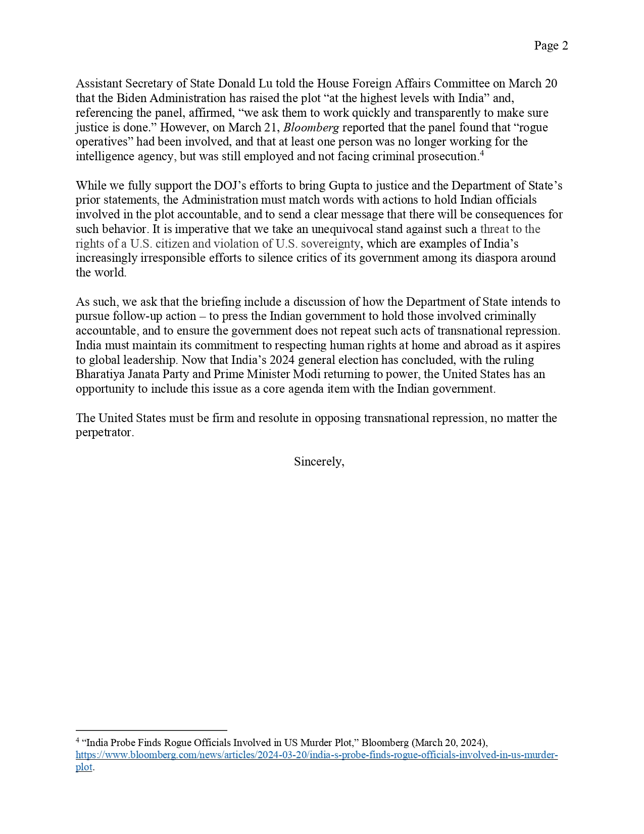"ਇਹ ਲਾਜ਼ਮੀ ਹੈ ਕਿ ਅਸੀਂ ਇੱਕ ਅਮਰੀਕੀ ਨਾਗਰਿਕ ਦੇ ਅਧਿਕਾਰਾਂ ਅਤੇ ਅਮਰੀਕੀ ਪ੍ਰਭੂਸੱਤਾ ਦੀ ਉਲੰਘਣਾ ਦੇ ਵਿਰੁੱਧ ਅਜਿਹੇ ਖ਼ਤਰੇ ਦੇ ਵਿਰੁੱਧ ਇੱਕ ਸਪੱਸ਼ਟ ਸਟੈਂਡ ਲਈਏ, ਜੋ ਕਿ ਦੁਨੀਆ ਭਰ ਵਿੱਚ ਆਪਣੀ ਸਰਕਾਰ ਦੇ ਆਲੋਚਕਾਂ ਨੂੰ ਚੁੱਪ ਕਰਨ ਲਈ ਭਾਰਤ ਦੇ ਵੱਧਦੇ ਗੈਰ-ਜ਼ਿੰਮੇਵਾਰਾਨਾ ਯਤਨਾਂ ਦੀਆਂ ਉਦਾਹਰਣਾਂ ਹਨ," ਉਨ੍ਹਾਂ ਨੇ ਪੱਤਰ ਵਿੱਚ ਕਿਹਾ।