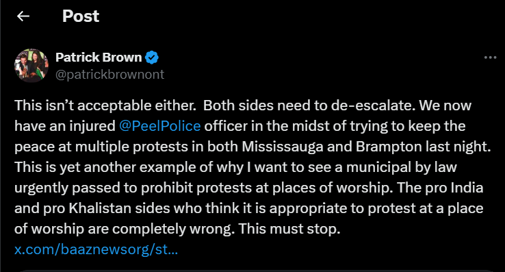 ਬਰੈਪਟਨ ਦੇ ਮੇਅਰ ਪੈਟਰਿਕ ਬ੍ਰਾਊਨ ਨੇ ਐਤਵਾਰ ਦੁਪਹਿਰ ਨੂੰ X ‘ਤੇ ਇੱਕ ਪੋਸਟ ਵਿੱਚ ਇਸ ਹਿੰਸਾ ਦੀ ਨਿੰਦਾ ਕਰਦੇ ਹੋਏ ਕਿਹਾ ਕਿ ਜ਼ਿੰਮੇਵਾਰ ਲੋਕਾਂ ਨੂੰ ਸਜ਼ਾ ਮਿਲਣੀ ਚਾਹੀਦੀ ਹੈ।