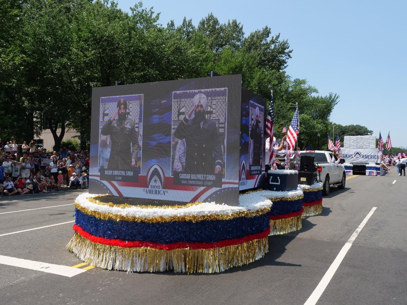 ਵਾਸ਼ਿੰਗਟਨ: ਅਮਰੀਕਨਾਂ ਅਤੇ ਇੱਥੇ ਵਸਦੇ ਸਮੂਹ ਭਾਈਚਾਰਿਆਂ ਵਲੋਂ 4 ਜੁਲਾਈ ਯਾਨੀ ਅਮਰੀਕਾ ਦੀ ਅਜ਼ਾਦੀ ਦਾ ਦਿਵਸ ਬਹੁਤ ਹੀ ਖੁਸ਼ੀ ਅਤੇ ਉਤਸ਼ਾਹ ਨਾਲ ਮਨਾਇਆ ਜਾਂਦਾ ਹੈ ਅਤੇ ਇਸ ਦਿਨ ਰਾਜਧਾਨੀ ਵਾਸ਼ਿੰਗਟਨ ਡੀ.ਸੀ. ਵਿਚ ਰਾਸ਼ਟਰੀ ਪੱਧਰ ਦੀ ਇਕ ਅਜ਼ਾਦੀ ਦੀ ਨੈਸ਼ਨਲ ਪਰੇਡ ਕੱਢੀ ਜਾਂਦੀ ਹੈ। ਕਿਸੇ ਵੀ ਭਾਈਚਾਰੇ ਨੂੰ ਇਸ ਪਰੇਡ ਵਿਚ ਆਪਣਾ ਫਲੋਟ ਸ਼ਾਮਿਲ ਕਰਨ ਦੀ ਪ੍ਰਵਾਨਗੀ ਮਿਲਣਾ ਬਹੁਤ ਵੱਡਾ ਕਾਰਜ ਮੰਨਿਆ ਜਾਂਦਾ ਹੈ। ਸਿੱਖਸ ਆਫ਼ ਅਮੈਰਿਕਾ ਵਲੋਂ ਪਿਛਲੇ 11 ਸਾਲਾਂ ਤੋਂ ਆਪਣਾ ਇਕ ਫ਼ਲੋਟ ਇਸ ਪਰੇਡ ਵਿਚ ਸ਼ਾਮਿਲ ਕੀਤਾ ਜਾਂਦਾ ਰਿਹਾ ਹੈ। ਇਸ ਸਾਲ ਵੀ ਚੇਅਰਮੈਨ ਜਸਦੀਪ ਸਿੰਘ ਜੱਸੀ ਦੀ ਅਗਵਾਈ ਵਿਚ ਸਿੱਖਸ ਆਫ਼ ਅਮੈਰਿਕਾ ਨੂੰ ਅਜ਼ਾਦੀ ਦੀ ਰਾਸ਼ਟਰੀ ਪਰੇਡ ਵਿਚ ਇਕ ਨਹੀਂ ਦੋ ਸਿੱਖ ਫ਼ਲੋਟ ਸ਼ਾਮਿਲ ਕਰਨ ਦੀ ਪ੍ਰਵਾਨਗੀ ਮਿਲੀ ਤੇ ਸਿੱਖਸ ਆਫ਼ ਅਮੈਰਿਕਾ ਨੇ ਇਸ ਪਰੇਡ ਵਿਚ ਦੋ ਸਿੱਖ ਫ਼ਲੋਟ ਸ਼ਾਮਿਲ ਕਰ ਕੇ ਸਭ ਭਾਈਚਾਰਿਆਂ ਦਾ ਦਿਲ ਜਿੱਤ ਲਿਆ।
