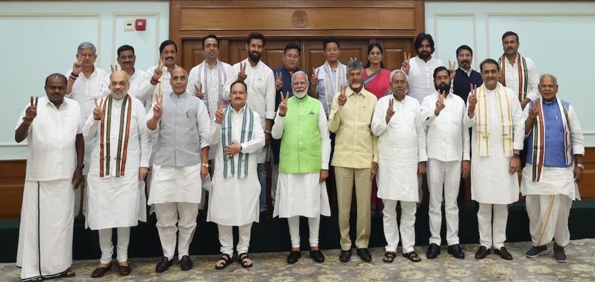 ਪ੍ਰਧਾਨ ਮੰਤਰੀ ਨਰਿੰਦਰ ਮੋਦੀ ਤੀਜੀ ਵਾਰ ਐਨਡੀਏ ਦੇ ਆਗੂ ਵਜੋਂ ਸਹੁੰ ਚੁੱਕਣ ਜਾ ਰਹੇ ਹਨ। ਭਾਰਤੀ ਜਨਤਾ ਪਾਰਟੀ ਇਸ ਵਾਰ ਬਹੁਮਤ ਤੋਂ 32 ਸੀਟਾਂ ਘਟ ਗਈ ਹੈ। ਹਾਲਾਂਕਿ ਭਾਜਪਾ ਦੀ ਅਗਵਾਈ ਵਾਲੀ ਐਨਡੀਏ ਨੂੰ ਬਹੁਮਤ ਮਿਲਿਆ ਹੈ। ਆਓ ਜਾਣਦੇ ਹਾਂ ਕਿ ਐਨਡੀਏ ਵਿੱਚ ਕਿਹੜੀਆਂ ਪਾਰਟੀਆਂ ਸਹਿਯੋਗੀ ਦੀ ਭੂਮਿਕਾ ਨਿਭਾ ਰਹੀਆਂ ਹਨ ਅਤੇ ਉਨ੍ਹਾਂ ਦੀਆਂ ਸੀਟਾਂ ਦੀ ਗਿਣਤੀ ਕਿੰਨੀ ਹੈ।
