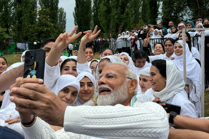 ਪ੍ਰਧਾਨ ਮੰਤਰੀ ਨਰਿੰਦਰ ਮੋਦੀ ਸ੍ਰੀਨਗਰ ਵਿੱਚ ਯੋਗ ਸਮਾਗਮ ਤੋਂ ਬਾਅਦ ਲੋਕਾਂ ਨਾਲ ਸੈਲਫੀ ਲੈਂਦੇ ਹੋਏ / X/@narendramodi