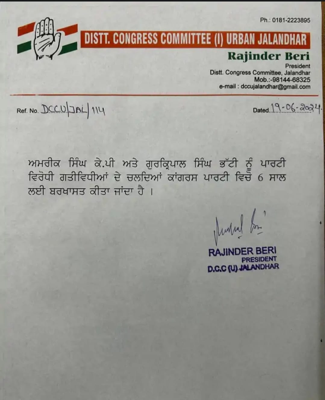 ਜਲੰਧਰ ਕਾਂਗਰਸ ਦੇ ਜ਼ਿਲ੍ਹਾ ਪ੍ਰਧਾਨ ਰਜਿੰਦਰ ਬੇਰੀ ਨੇ ਬੁੱਧਵਾਰ ਨੂੰ ਇਸ ਸਬੰਧੀ ਪੱਤਰ ਜਾਰੀ ਕੀਤਾ ਹੈ / Courtesy Photo