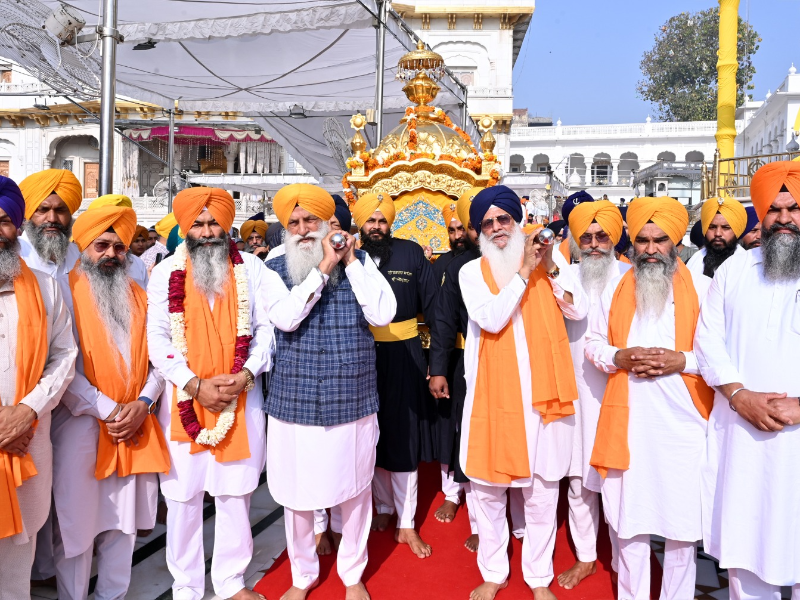 ਸ੍ਰੀ ਅਕਾਲ ਤਖ਼ਤ ਸਾਹਿਬ ਵਿਖੇ ਅਰਦਾਸ ਉਪਰੰਤ ਨਗਰ ਕੀਰਤਨ ਦੀ ਰਵਾਨਗੀ ਮੌਕੇ ਸ੍ਰੀ ਅਕਾਲ ਤਖ਼ਤ ਸਾਹਿਬ ਦੇ ਕਾਰਜਕਾਰੀ ਜਥੇਦਾਰ ਤੇ ਤਖ਼ਤ ਸ੍ਰੀ ਕੇਸਗੜ੍ਹ ਸਾਹਿਬ ਦੇ ਜਥੇਦਾਰ ਗਿਆਨੀ ਕੁਲਦੀਪ ਸਿੰਘ ਗੜਗੱਜ ਨੇ ਸ੍ਰੀ ਗੁਰੂ ਗ੍ਰੰਥ ਸਾਹਿਬ ਜੀ ਦਾ ਪਾਵਨ ਸਰੂਪ ਪਾਲਕੀ ਸਾਹਿਬ ਵਿਚ ਸੁਸ਼ੋਭਿਤ ਕੀਤਾ।