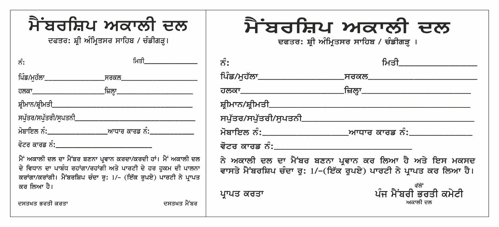 ਅਕਾਲੀ ਦਲ ਦੀ ਭਰਤੀ ਸਲਿਪ / Courtesy Photo