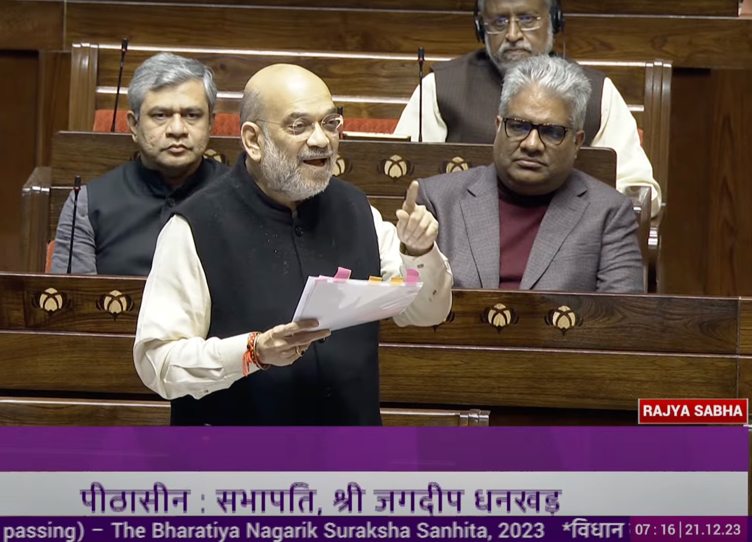 ਸੰਸਦ ਵਿੱਚ ਤਿੰਨ ਅਪਰਾਧਕ ਕਾਨੂੰਨ ਬਾਰੇ ਗੱਲ ਕਰਦੇ ਹੋਏ ਭਾਰਤ ਦੇ ਗ੍ਰਹਿ ਮੰਤਰੀ ਅਮਿਤ ਸ਼ਾਹ। / YouTube@SansadTV