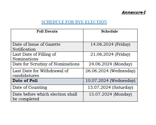 ਚੋਣ ਨੋਟੀਫਿਕੇਸ਼ਨ 14 ਜੂਨ ਨੂੰ ਜਾਰੀ ਕੀਤਾ ਜਾਵੇਗਾ / Courtesy Photoਚੋਣ ਨੋਟੀਫਿਕੇਸ਼ਨ 14 ਜੂਨ ਨੂੰ ਜਾਰੀ ਕੀਤਾ ਜਾਵੇਗਾ। ਨਾਮਜ਼ਦਗੀ ਪੱਤਰ ਦਾਖਲ ਕਰਨ ਦੀ ਆਖਰੀ ਮਿਤੀ 21 ਜੂਨ ਹੈ। ਨਾਮਜ਼ਦਗੀਆਂ ਦੀ ਪੜਤਾਲ 24 ਜੂਨ ਨੂੰ ਹੋਵੇਗੀ ਅਤੇ ਨਾਮਜ਼ਦਗੀ ਪੱਤਰ ਵਾਪਸ ਲੈਣ ਦੀ ਆਖਰੀ ਮਿਤੀ 26 ਜੂਨ ਹੈ। ਜ਼ਿਮਨੀ ਚੋਣ 10 ਜੁਲਾਈ ਨੂੰ ਹੋਵੇਗੀ ਅਤੇ ਵੋਟਾਂ ਦੀ ਗਿਣਤੀ 13 ਜੁਲਾਈ ਨੂੰ ਹੋਵੇਗੀ। ਚੋਣ ਕਮਿਸ਼ਨ ਨੇ ਕਿਹਾ ਕਿ ਜ਼ਿਮਨੀ ਚੋਣਾਂ 15 ਜੁਲਾਈ ਤੋਂ ਪਹਿਲਾਂ ਮੁਕੰਮਲ ਹੋਣੀਆਂ ਹਨ।